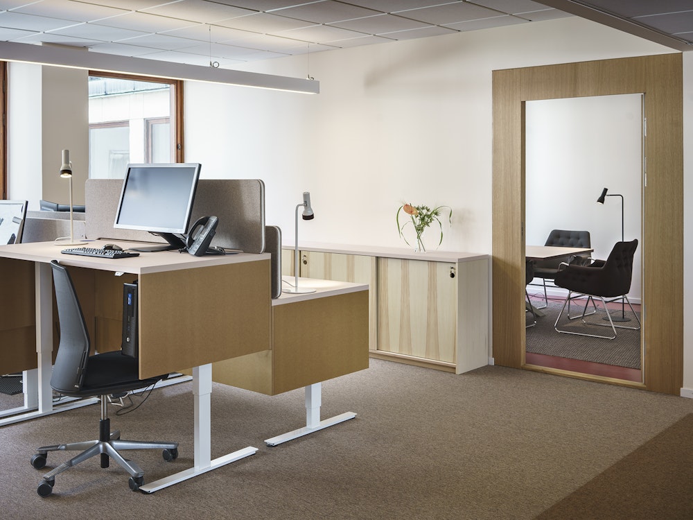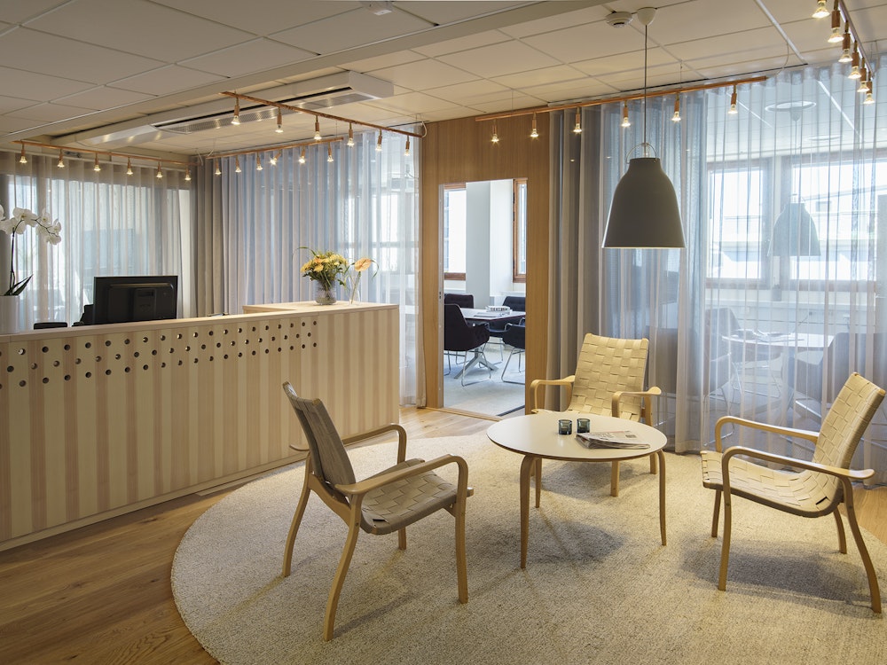 Besökaren möts av receptionen, som ligger i direkt anknytning till externa mötesrum, kök och kaffeservering. Zonen utgör ett mellanting mellan arbetsplats och lobby, där ett mer informellt umgänge kan ta plats.
