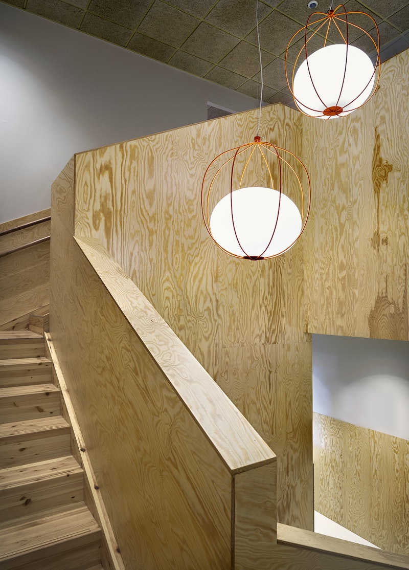 Det röda temat återkommer i entrégolv och kapprummen. På insidan är väggar klädda med hårdvaxoljad furuplywood nedtill. Den centrala trappan i furu blir en samlingsplats med sittytor längst ner. Bröstningen i plywood är genomgående i hela byggnaden och binder ihop interiören tillsammans med dörr- och fönsterpartier i trä.