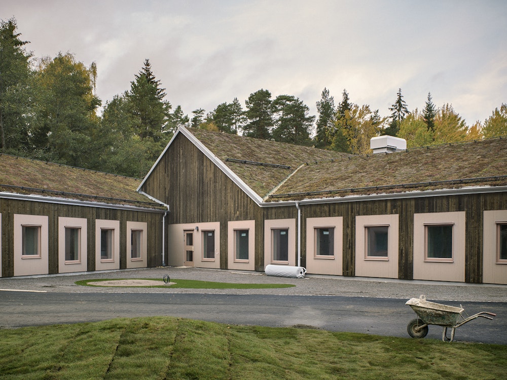 Förskolebyggnaden är låg och knyter i skala och uttryck an till den närbelägna villabebyggelsen. Trärena fasader i järnvitriolbehandlad furu - med tiden grå, som skogen - ger taktilitet och tålighet. Genom nischer i avvikande kulör markeras fönster och entréer samtidigt som byggnaden ges en lekfull identitet. Tak i sedum ger ekologiska mervärden och bildar ett vackert blickfång för de boende på de övre våningarna i vård- och omsorgsboendet.