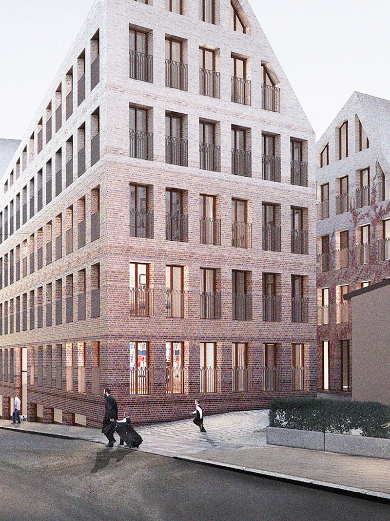 Vi föreslår 51 lägenheter fördelade på två huskroppar i en byggnadsstruktur som anpassar sig till omgivningen men vars gestaltning är egen och samtida. Fasaderna utförs i en blandning av nytt och återvunnet tegel i rödbruna och gula toner – en gradient som anspelar på klassiska arkitekturstilars indelning i en tyngre, rusticerad sockelvåning och lättare gestaltade övre våningar. De intillliggande tegelfabriksbyggnadernas karaktär har inspirerat till de nya byggnadernas vertikalt proportionerade fasader med upprätt stående glaspartier, franska balkonger och detaljerade smidesräcken.