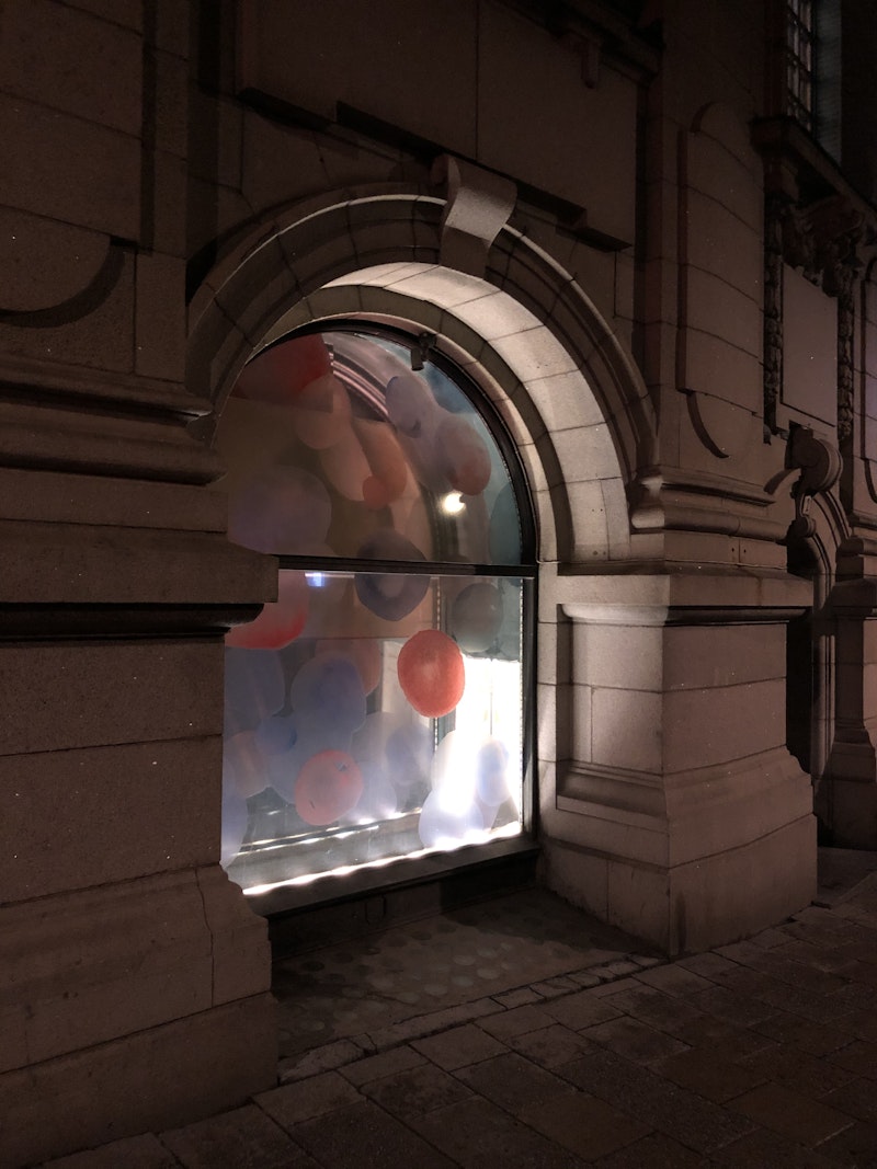 Längs fasaderna i Kv Jakob Mindre 11 sträcker sig en abstrakt fönsterutsmyckning med bubblor i röda, gröna och blå toner. Bubblorna varierar i skala och intensitet över de 18 fönsterpartier som breder ut sig längs tre fastigheter utmed Regeringsgatan, Jakobsgatan och mot Stockholms geografiska mittpunkt, Gustav Adolfs torg. De handmålade bubblorna av akvarell är applicerade på fönsterglasen och kan upplevas i flera lager genom en bakomliggande, speglande skiva som monterats med en distans till fönsterglasen. I den speglande ytan reflekteras både själva bubblorna på glaset men även det bakomliggande stadsrummet med fasader, träd och belysning, samt förbipasserande bilar, cyklister och fotgängare. I fönsterpartierna har belysning monterats för att ge liv åt utsmyckningen även efter mörkrets fall. Vissa av kvarterets fönster ligger i djupa nischer och där får belysningen också en effekt av att belysa själva nischen och betona fasadens tredimensionalitet.