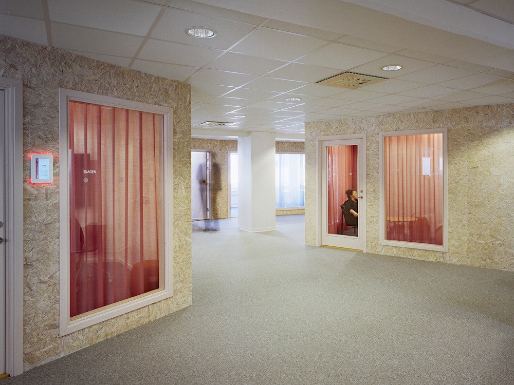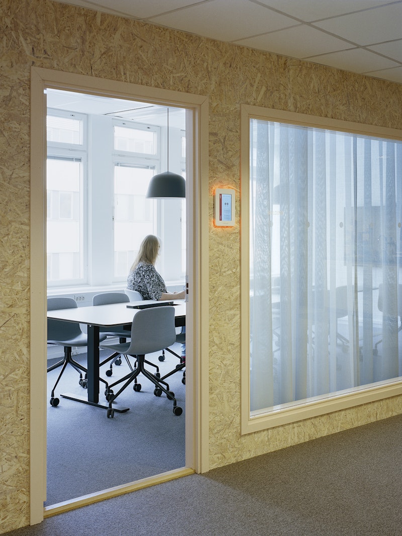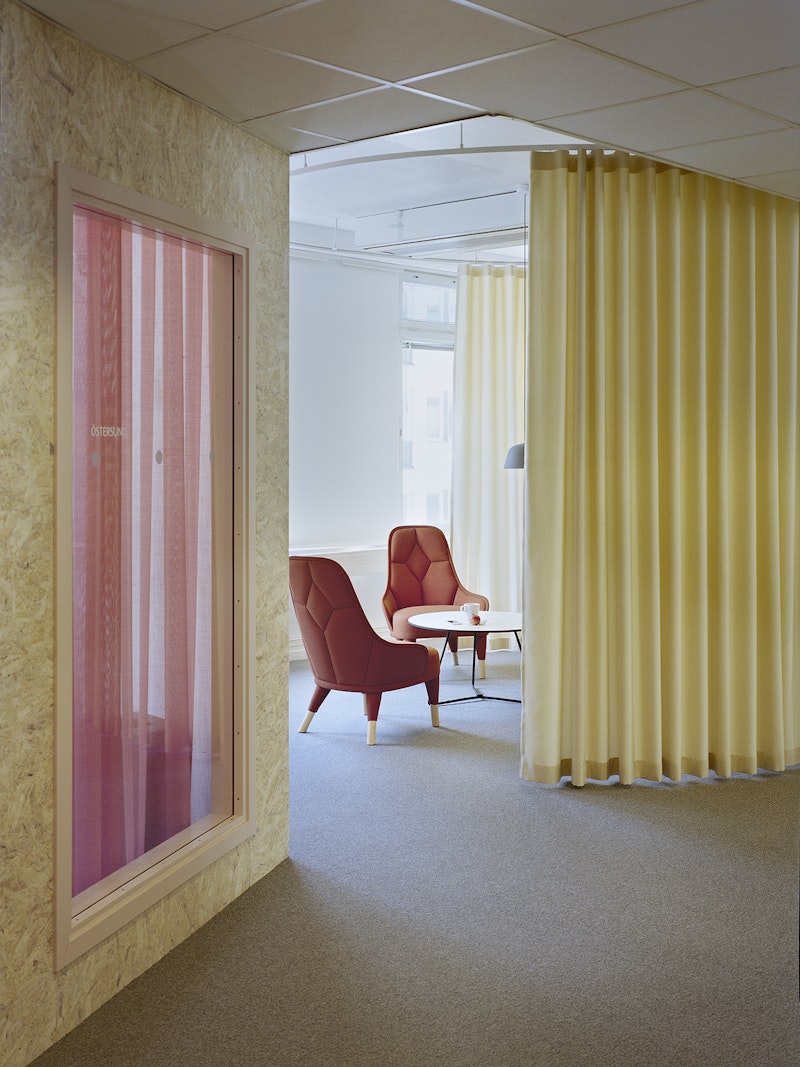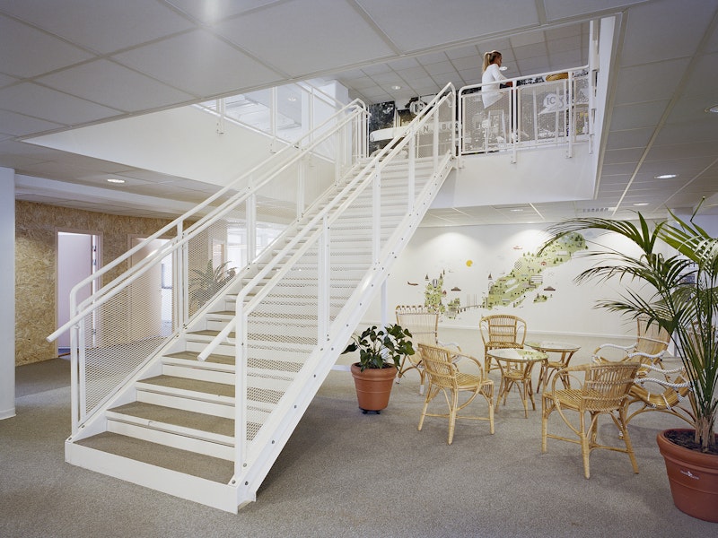 För att kommunikation och samverkan ska ske mellan de två våningsplanen öppnades bjälklaget upp till förmån för en generös och öppen interntrappa. Aktiviteten i verksamheten utgår från området kring trappan med hög intensitet och avtar ju längre bort man kommer – här ligger de helt tysta zonerna. Mötesrummen är placerade i grupper med arbetsplatser emellan för att de öppna kontorsytorna inte ska bli för stora och opersonliga. Dörrar och glaspartier är lackade i ljusrosa, en kulör som symboliserar den utmaning OKQ8 står inför med tanke på kraven på fossilfria drivmedel inom en snar framtid.