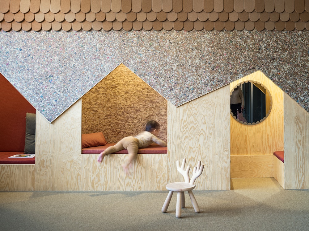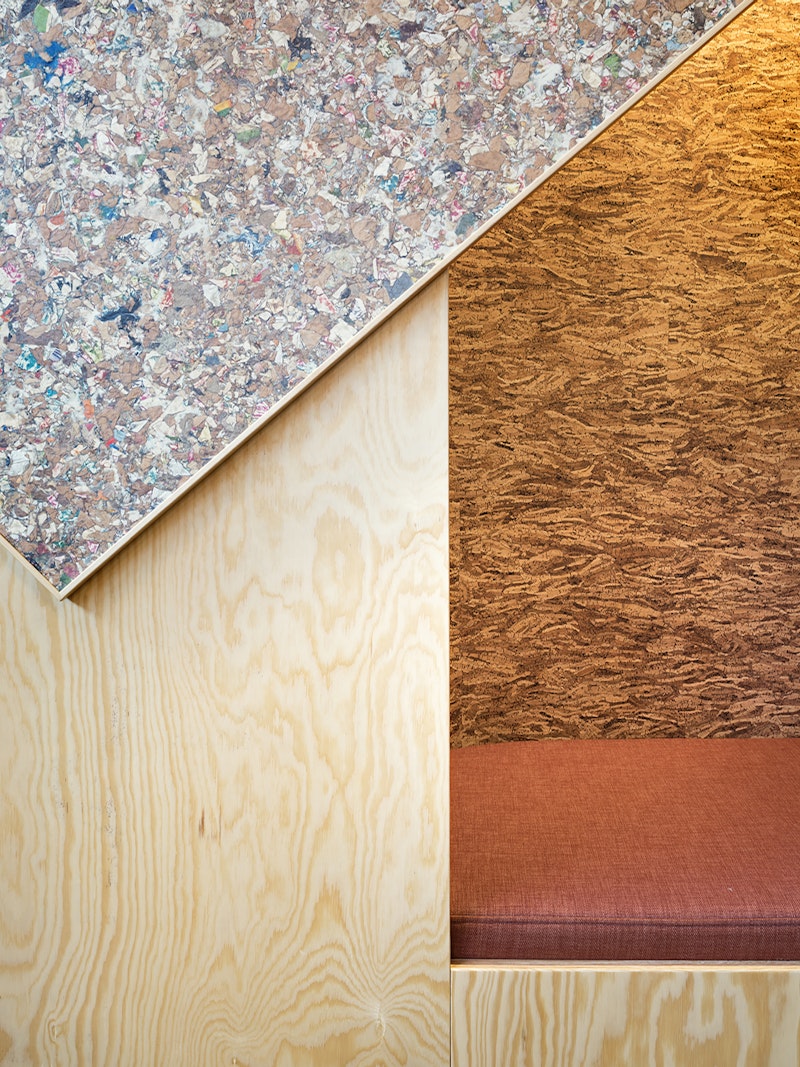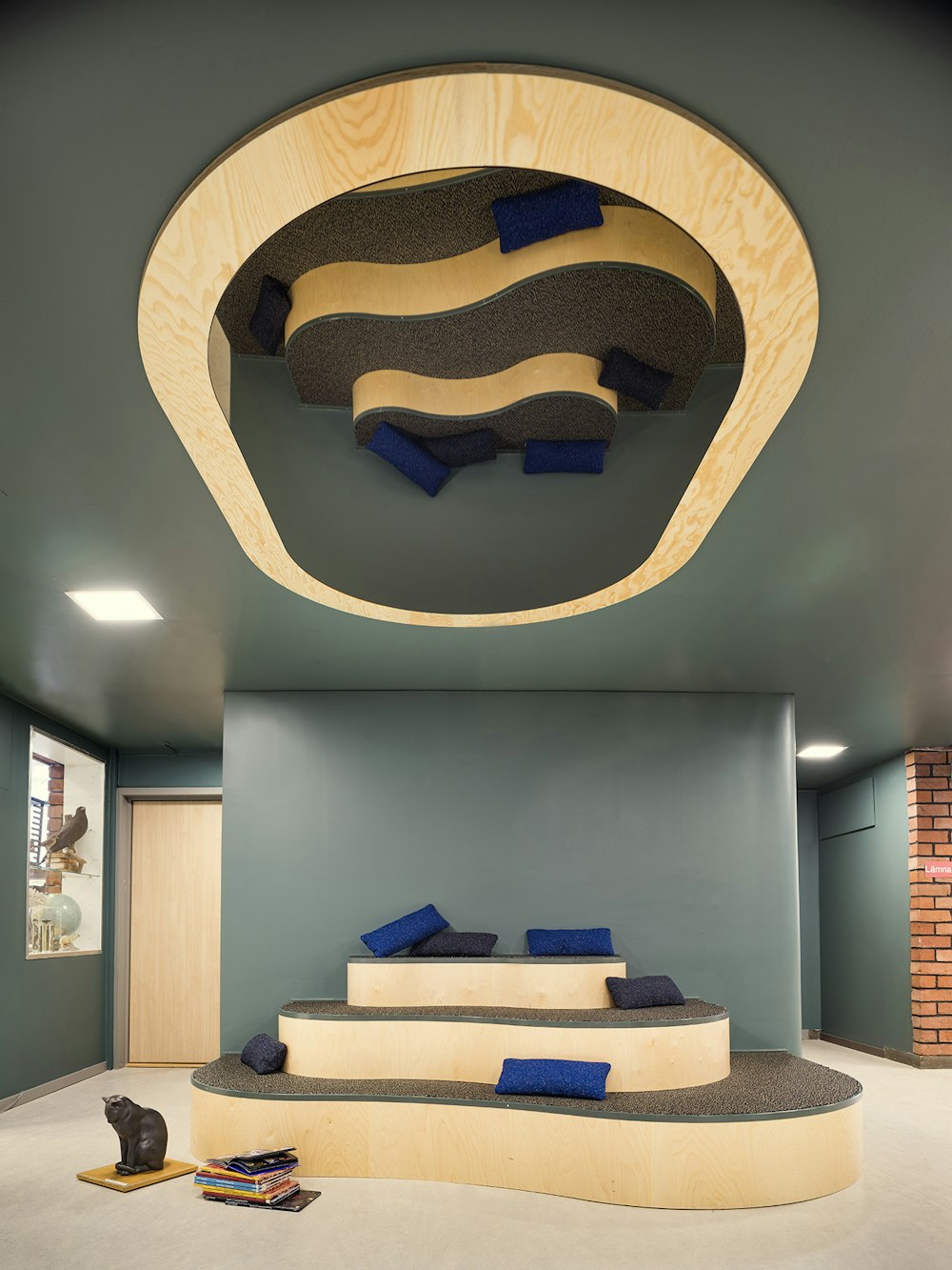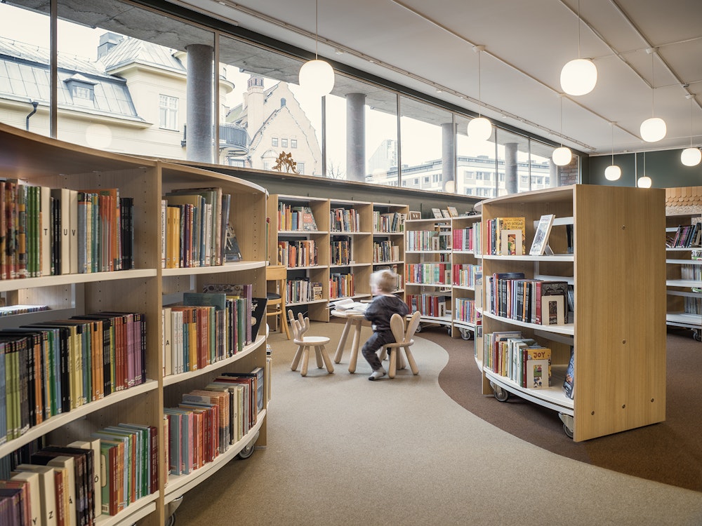 I och med ombyggnationen har rummen gestaltats med tydligt formspråk och varierad materialitet. Från verksamheten fick vi uppdraget att skapa en sagoskog med referenser till Västerås skärgård och närliggande naturreservat. Det återspeglas i gestaltningen av sittgradänger utformade som öar/höjdkurvor som reflekteras i en takspegel med besläktad form. Välvda bokhyllor skapar välkomnande rumsformationer och varierade kryp-in-rum inbjuder mindre barn att utforska rumsligheterna. Formspråket kan kopplas till byggnadens ursprungliga inslag av rundade former som möter rätlinjiga och den nya inredningens färgsättning, textilier och platsbyggda möbler förhåller sig till detaljer, mönster och kulörer i den befintliga interiören. Byggnadens originalmosaik och taktilitet har inspirerat till den interiöra sammansättningen av hållbara material. Paletten består av trä, massivkork samt skivmaterial av återvunna kompositförpackningar. Möbler och boktråg har målats om och återbrukats.