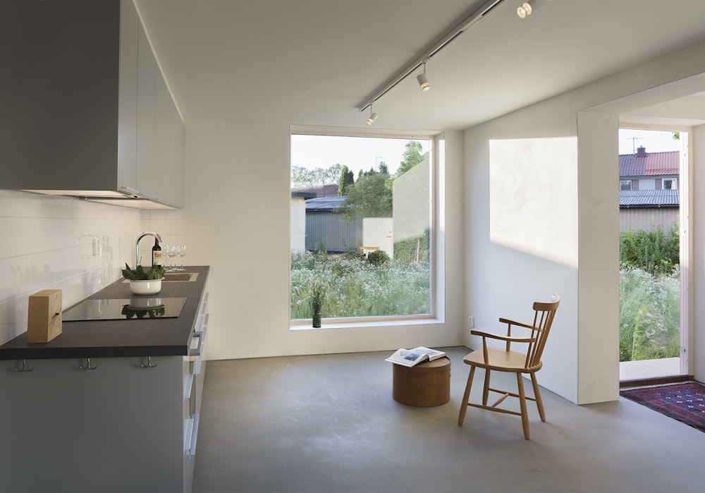 Placeringen av tillbyggnaden blev ett sätt att rama in tomtens kvalitéer och angreppssättet ett sätt att tackla typologins problem och fördelar. Till ursprungsbyggnaden adderar vi rektangulära block som alla underordnar sig originalet. De nya volymerna får en golvnivå som relaterar till marknivån utanför och kan på det sättet lösa upp den tidigare strikta uppdelningen mellan källare och bostadsplan samt den mellan inne och ute. Orangeriets stora glasparti vetter mot söder och halvplansförskjutningen gör att golvnivån kommer i direkt anslutning till marken utanför.