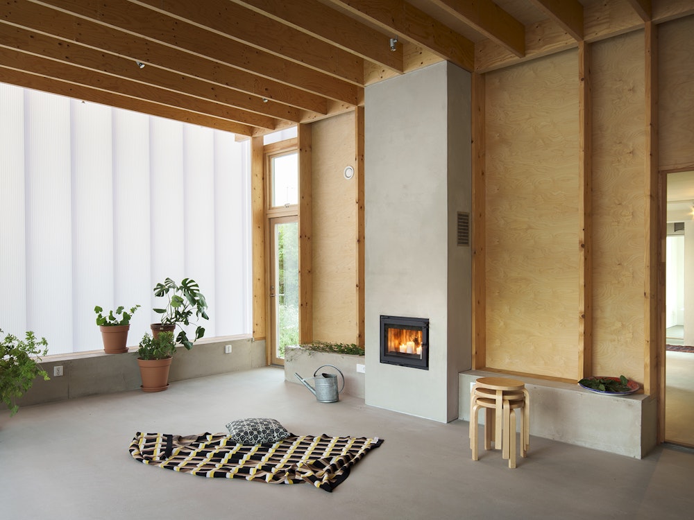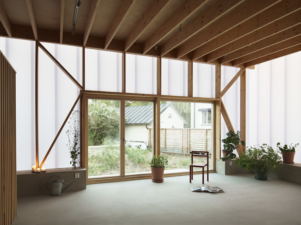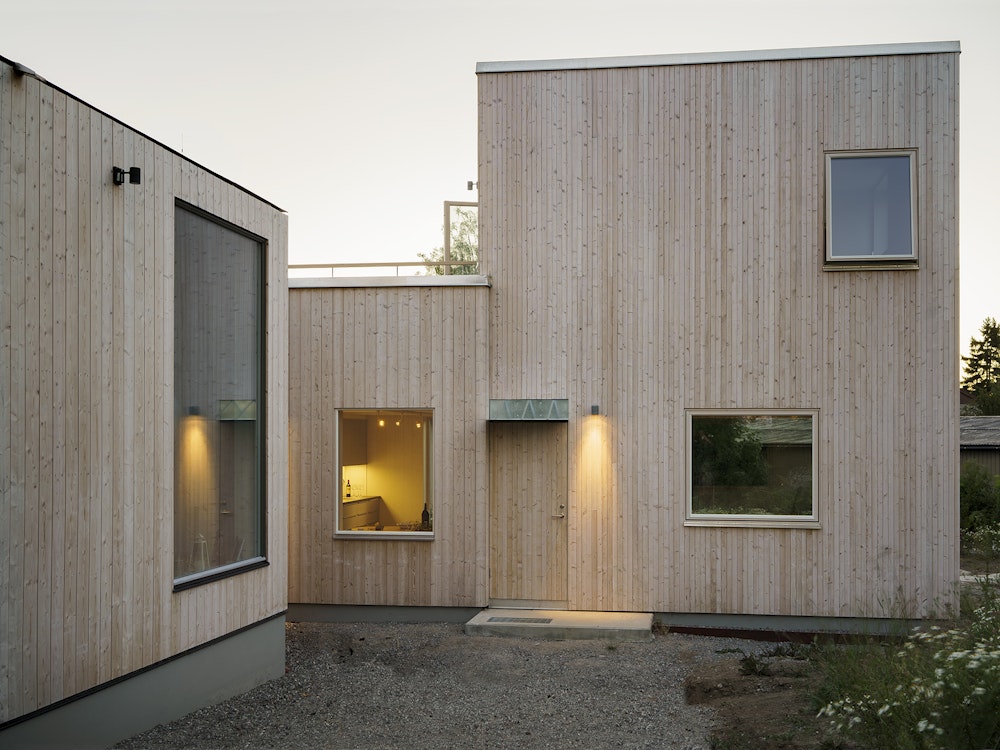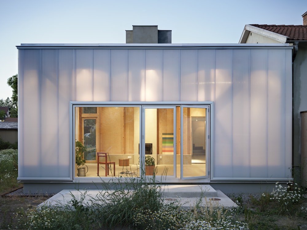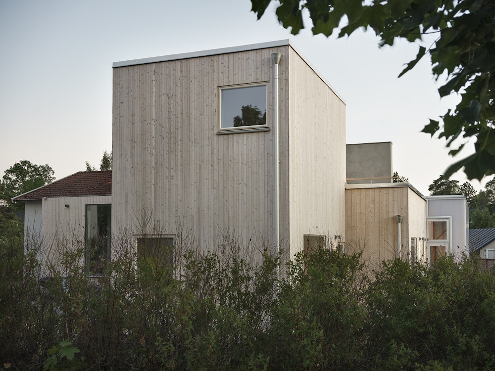 Tilläggen är exteriört klädda i stående träpanel, behandlad för att med åren få en silvervit färg. Orangeriet har fasad av translucent kanalplast. Tanken är att de olika invändiga programmen, orangeri och bostad, exteriört byter skepnad över årets och dygnets timmar. De både liknar varandra och är varandras motsatser.